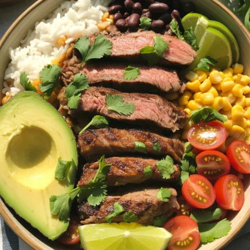 Cilantro lime steak bowl with grilled steak, rice, avocado, corn, black beans, cherry tomatoes, and fresh lime.