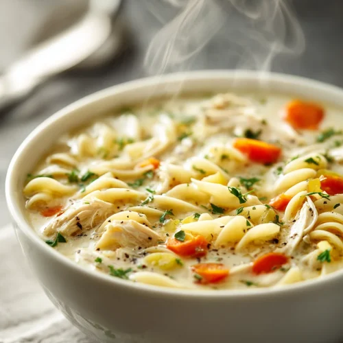 Creamy chicken noodle soup isn’t just dinner — it’s comfort you can ladle into bowls. It’s easy enough for weeknights yet warm enough to bring people together around your table. When you stir this pot, you’re doing more than cooking — you’re creating calm, connection, and something nourishing.